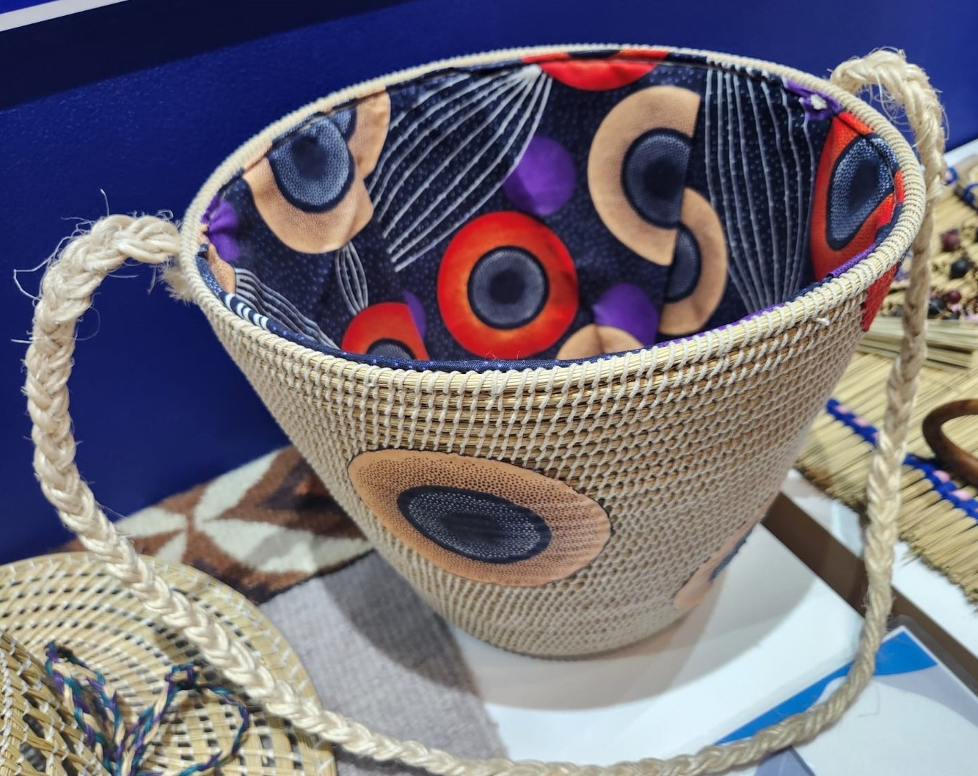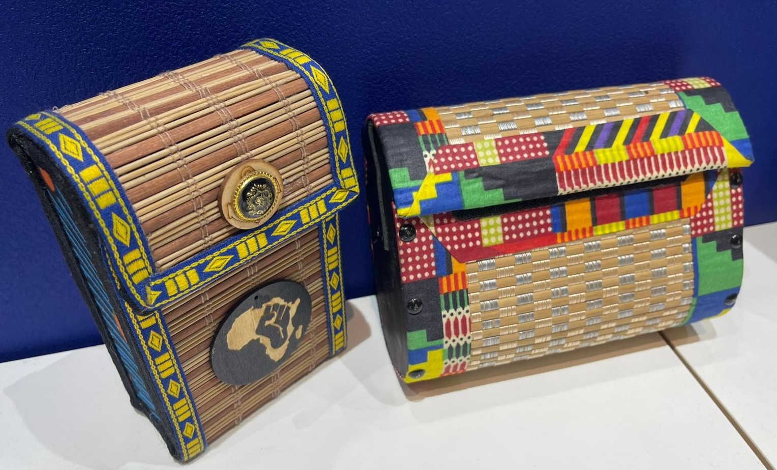 Handcrafted straw bags, designed with a sophisticated blend of natural woven straw and authentic African fabric accents.