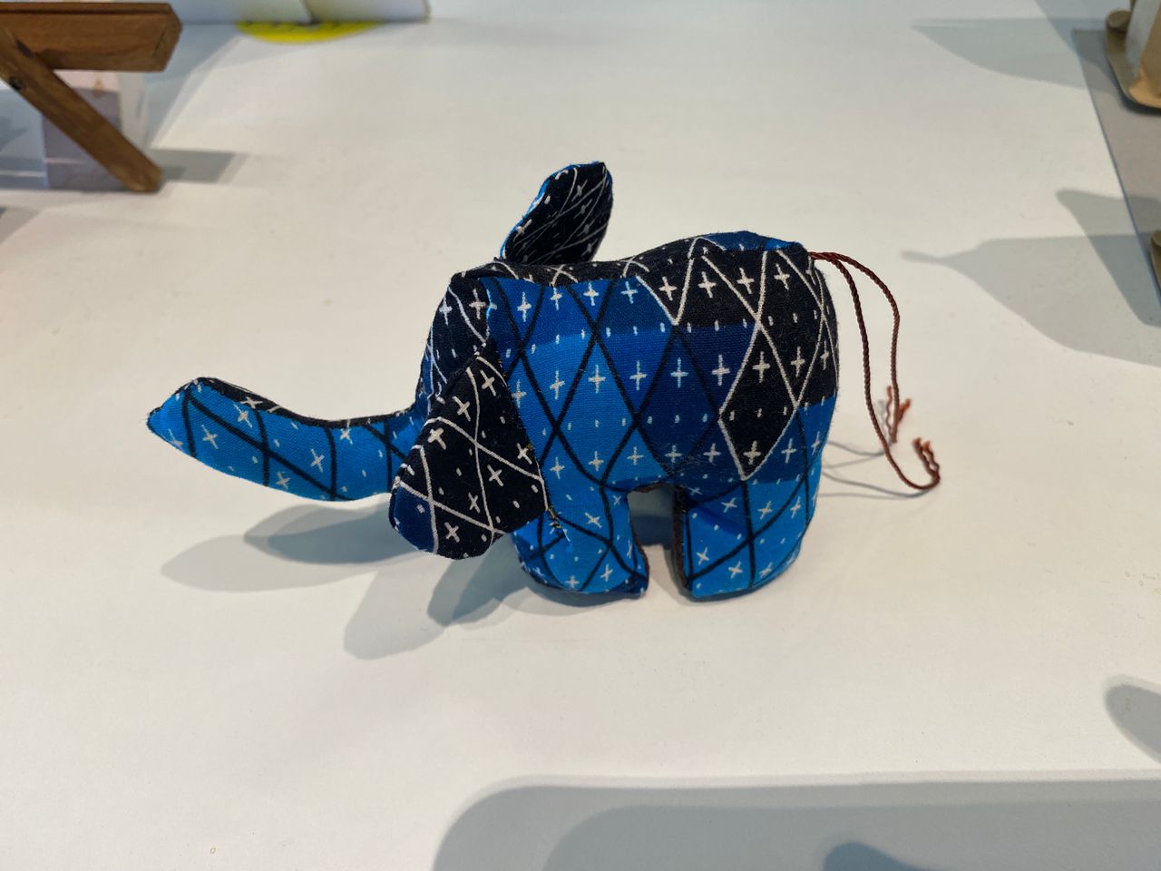 青と黒のアフリカンプリントで作られた象。他の色サイズもあります