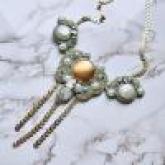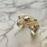 ヨーロッパの伝統技法であるソウタシエという技法を用いてアクセサリー制作をしております。もともと貴族のドレスやジャケットの装飾に用いられていたこの技法は、優雅な雰囲気を醸し出します。専用のコードを使用し、ビーズなどに沿わせながら針と糸で縫っていく、手間のかかる技法です。